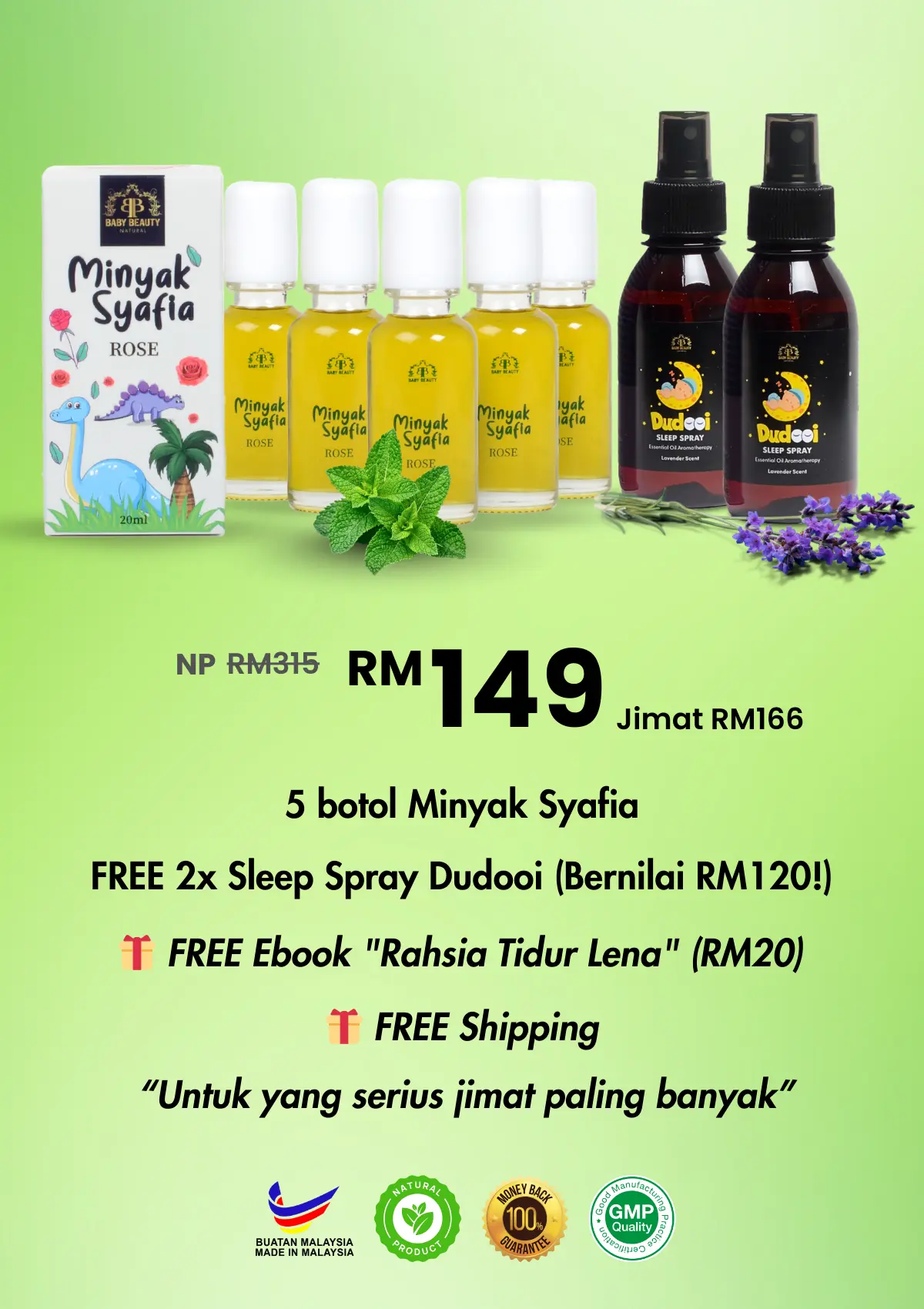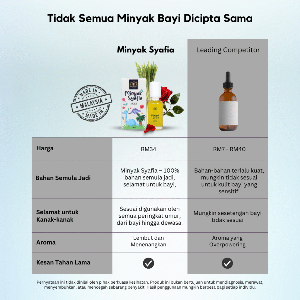 1) Aroma Unik: Kami menggunakan pati Minyak Bunga Mawar (Rose Essential Oil) yang mewah, memberikan efek menenangkan bukan sahaja untuk bayi, tetapi juga untuk ibu.