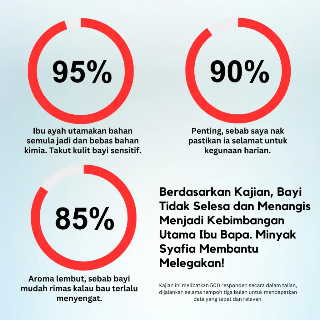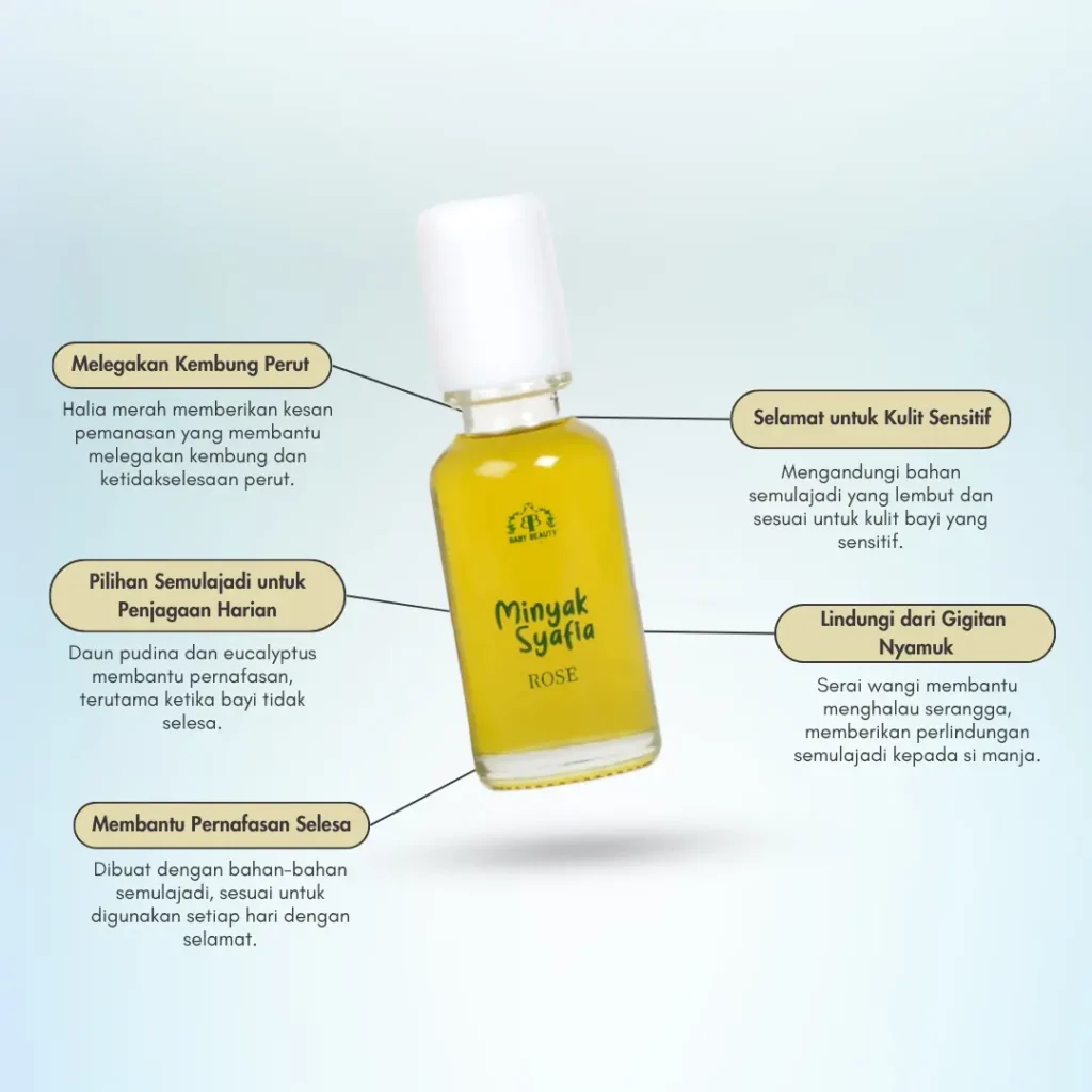 Ya, sangat selamat. Minyak Syafia diformulasi menggunakan 100% bahan semulajadi dan tidak mengandungi bahan kimia terlarang seperti menthol atau kapur barus. Ia sangat lembut dan direka khas untuk kulit bayi yang sensitif, termasuk bayi baru lahir.