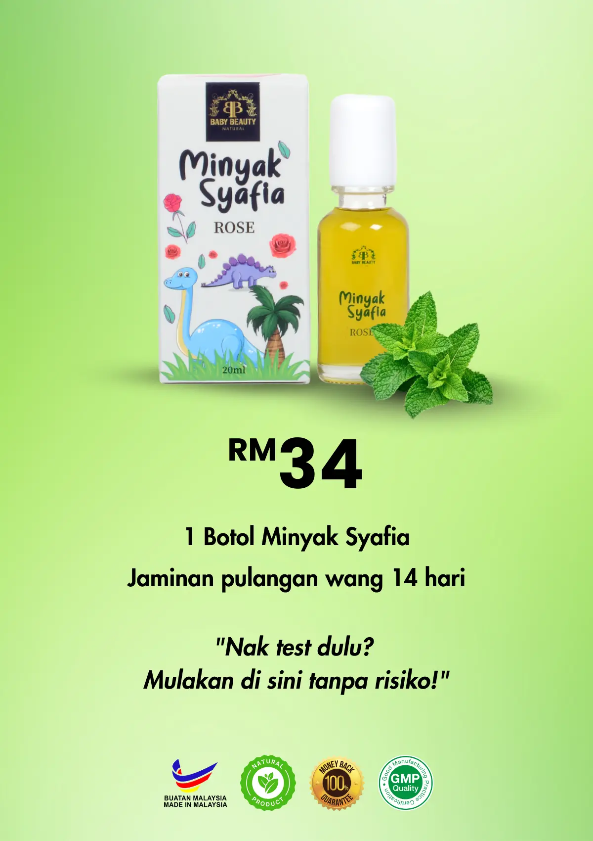 Cuba Minyak Syafia selama 14 hari. Jika dalam tempoh itu anda atau si manja langsung tidak merasai perbezaan, jika anda tidak berpuas hati dengan apa jua sebab, pulangkan semula botol dan kami akan pulangkan wang anda 100%.